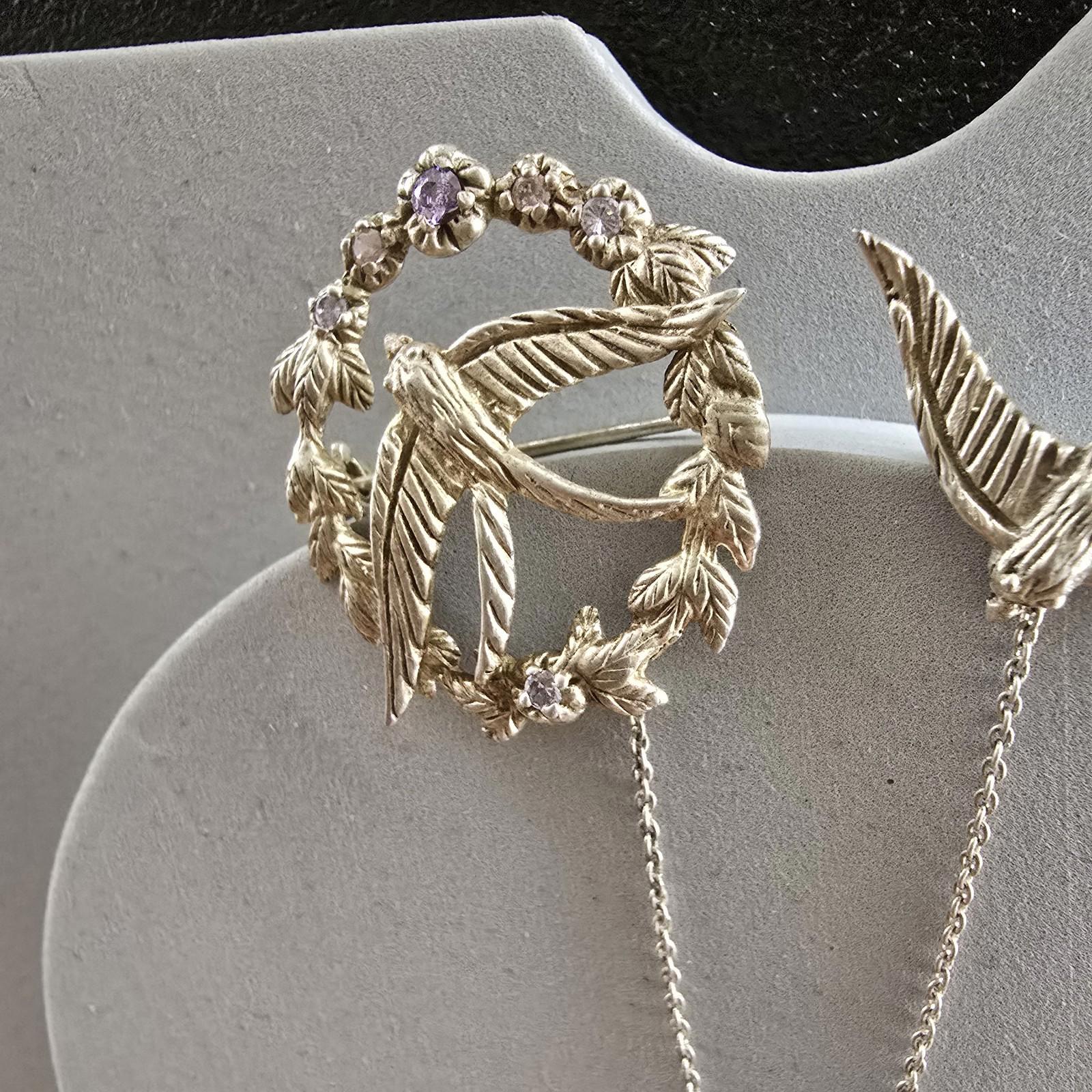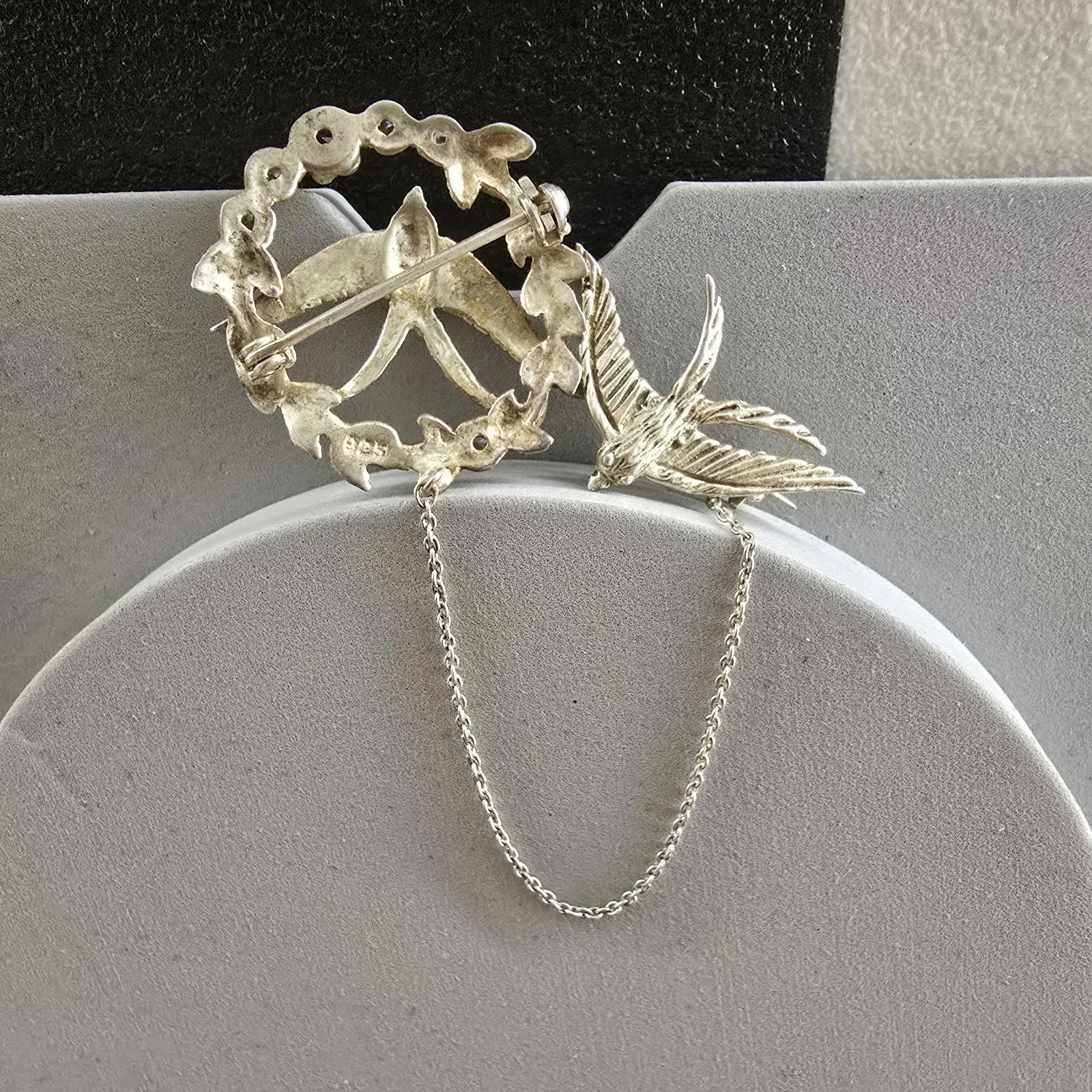 Antique Solid Silver Swallow Bird Brooch With Gemstones Plus Safety Swallow