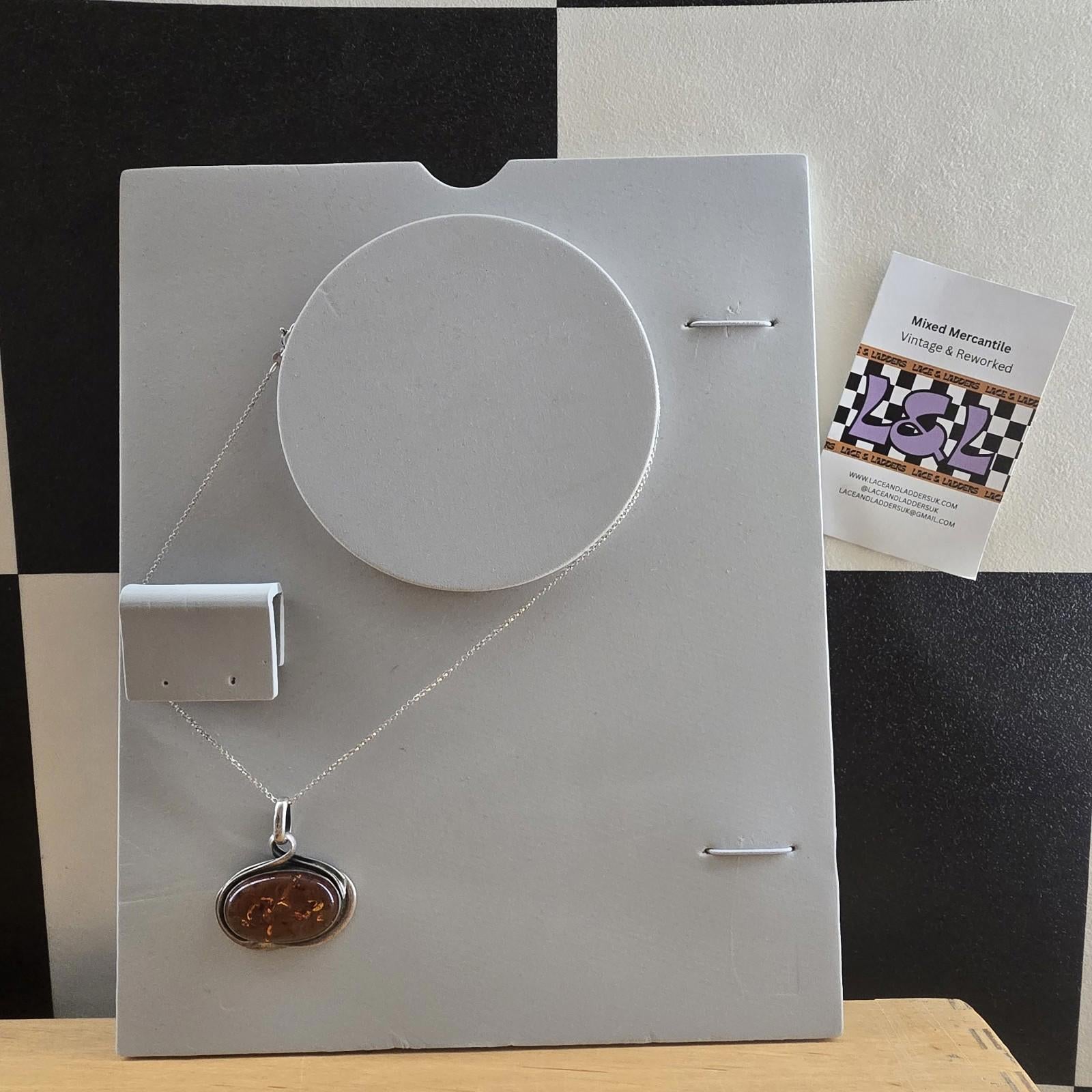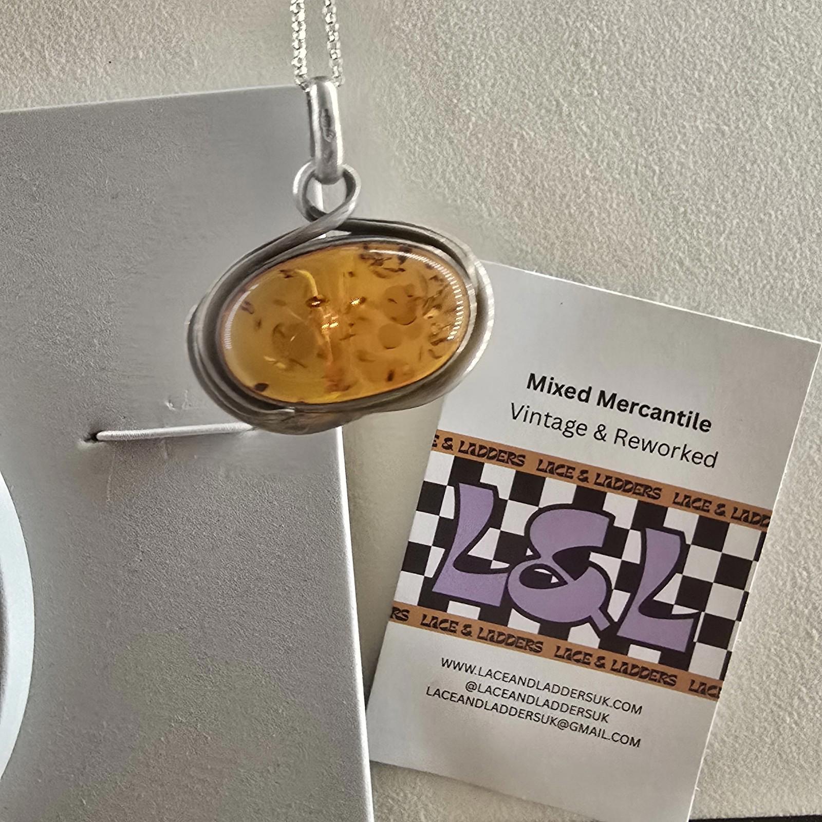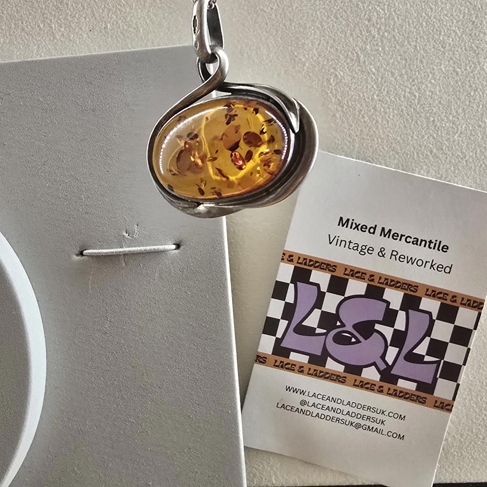 This vintage pendant features a large oval-shaped Baltic Amber stone set in 925 sterling silver. The natural brown-coloured Amber is sourced from Poland and set in a bezel setting. The pendant is nickel-free and crafted by Amber America, making it a unique and stylish accessory for women. The oval shape and intricate design make it a standout piece that adds a touch of elegance to any outfit.