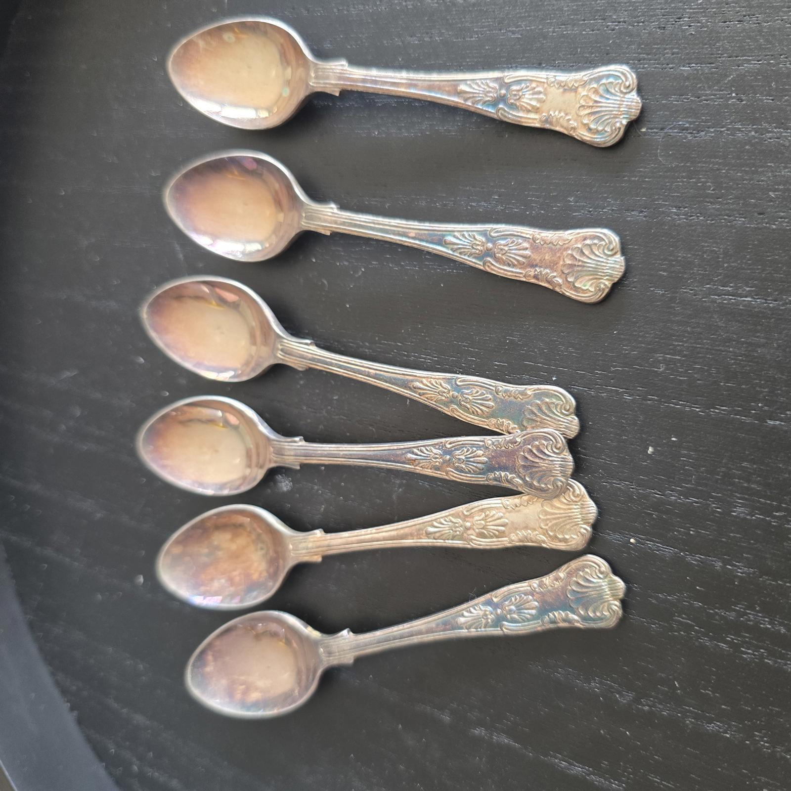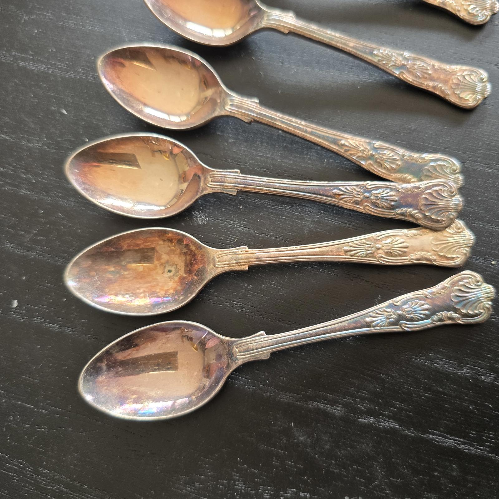 Set of six vintage silver plated spoons with ornate detailing on the handles.