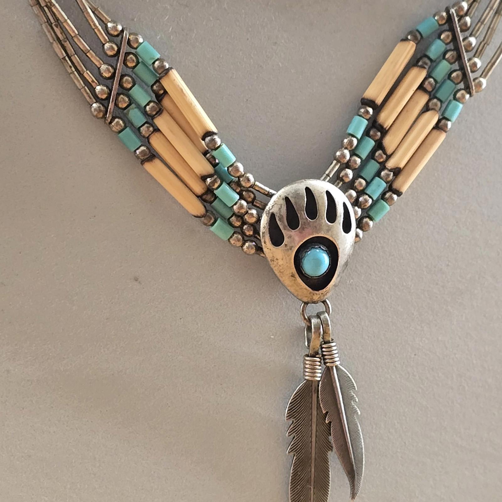 Vintage Carolyn Pollack Southwestern Liquid Silver Stone Claw Feather Necklace