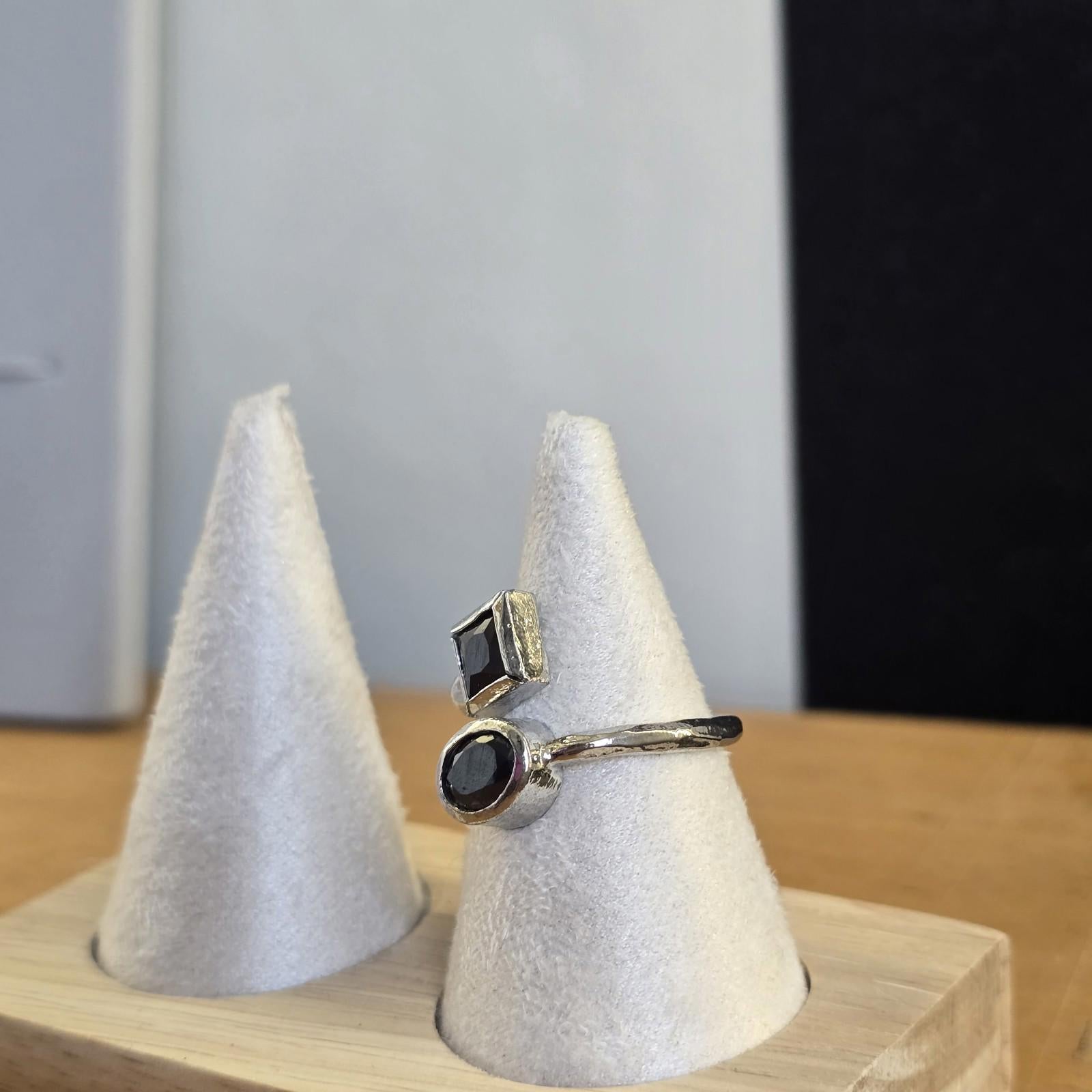 This vintage costume ring features a unique silver and black stone design, perfect for adding a touch of elegance to any outfit. The size T ring is made from high-quality materials with excellent cut grade, making it a standout piece for any jewellery collection. Whether worn as a statement piece or as a subtle accent, this ring is sure to make a statement with its distinctive design.