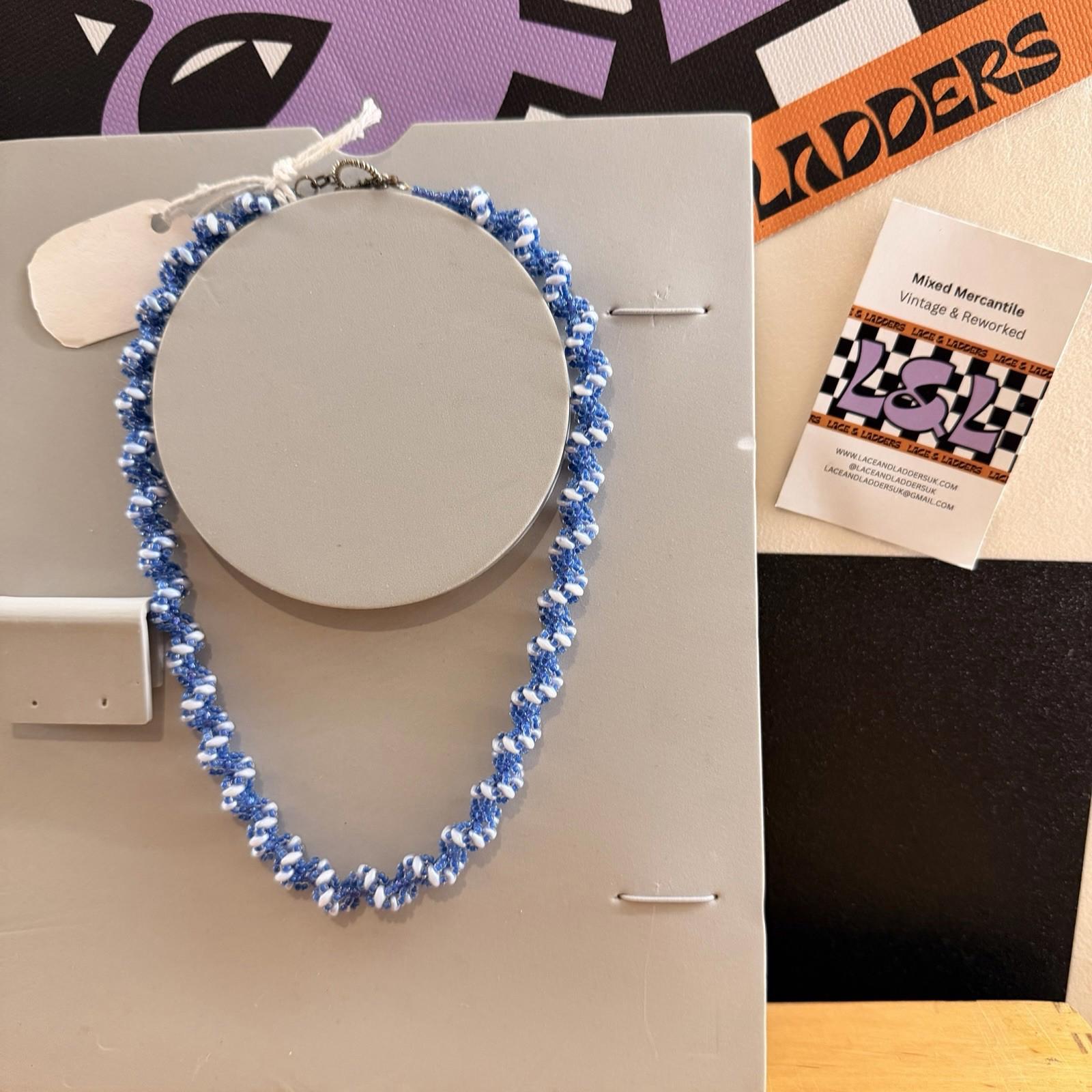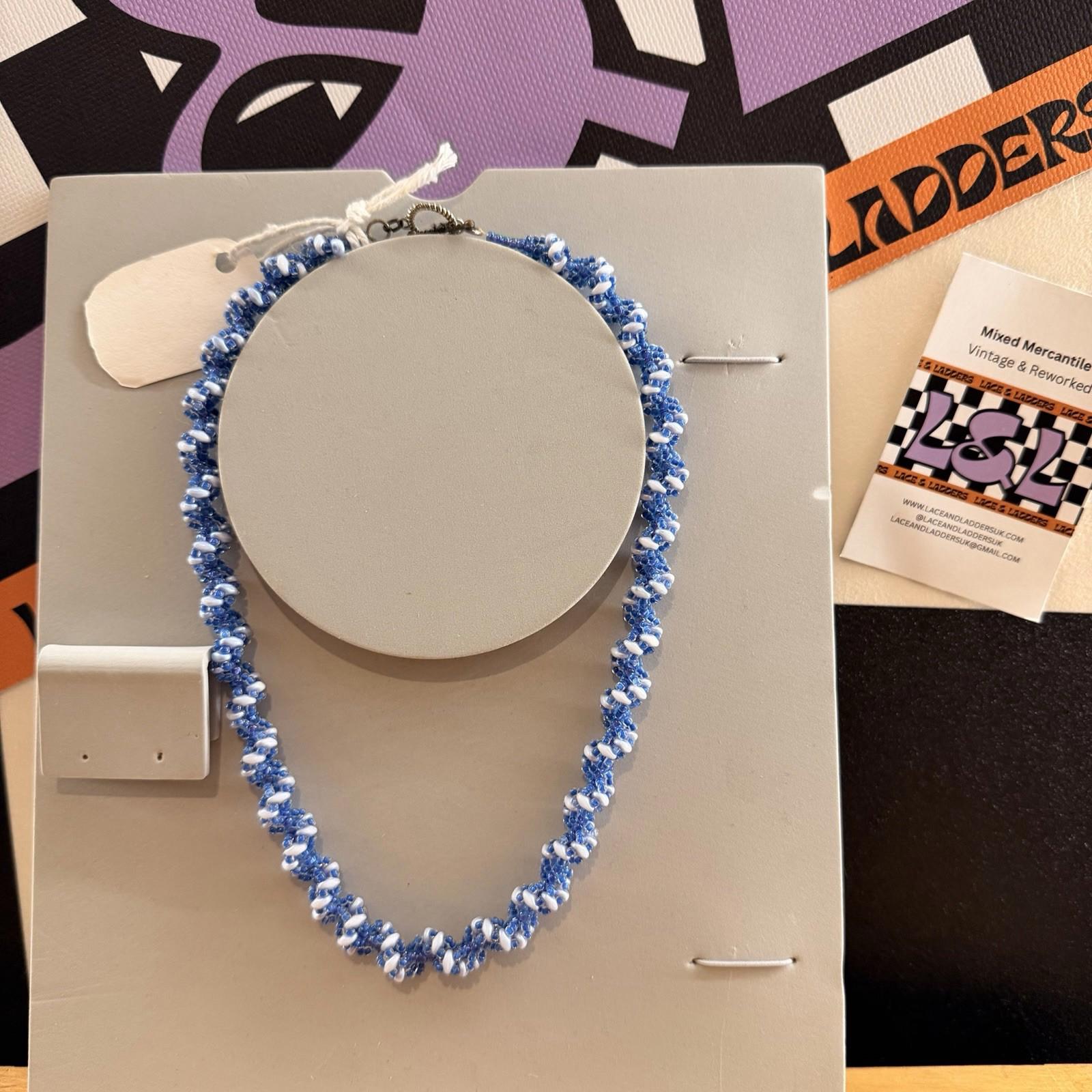 This vintage handmade twist beaded necklace in blue and white is a unique and charming accessory. Made with care and attention to detail, this necklace features a classic beaded style that adds a touch of elegance to any outfit. The blue colour adds a pop of vibrancy, making it a versatile piece that can be worn for various occasions. Made with a twist technique, this necklace is sure to stand out and make a statement.
